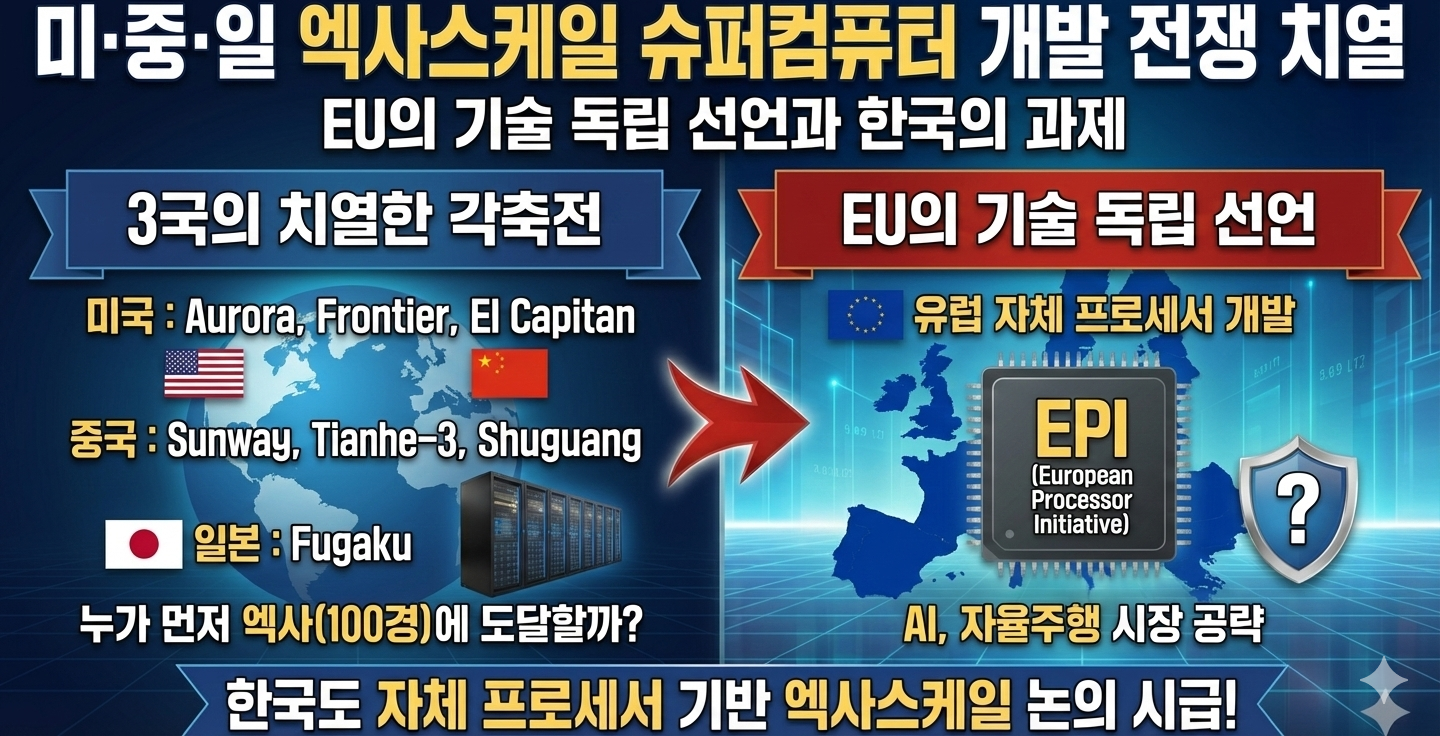 지난 30여 년간 줄곧 세계에서 제일 빠른 슈퍼컴퓨터 보유국의 자리를 놓고 미·중·일 간에 엎치락뒤치락하며 치열하게 각축을 벌여왔기에 이들 3국이 최초의 엑사급 슈퍼컴퓨터 자리를 놓고 치열한 경쟁을 벌이고 있는 것은 그리 놀랍지도 새롭지도 않다. 오히려 지금 관심을 갖고 한번 지켜봐야 할 점은 엑사급 슈퍼컴퓨터를 바라보는 유럽연합(EU)의 시각 변화다. 그 동안 EU는 슈퍼컴퓨터 도입·구축 및 소프트웨어관련 연구개발에는 예산을 투입하였지만 하드웨어 연구개발에는 예산을 거의 투입하지 않았다. 이러한 정책 때문에 지금까지 유럽 내 슈퍼컴퓨터의 대부분은 글로벌 제조사들을 통해서 구축되고 있다.
